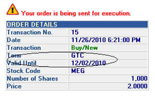 The COLFinancial GTC orders are limit orders which are valid for seven (7) calendar days. For example, if the GTC order is entered on November 26, the order will be valid until January 25. If the Valid Until date is a non-trading day, it will no longer be valid on the next trading day which follows. For example, if a GTC order is valid until November 20 which is a Saturday, on November 22 (Monday) which is the first trading day that follows, the GTC order will no longer be valid. ENTERING GTC ORDERS