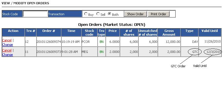 Note that the Term field column should indicate GTC and the Valid Until field column should indicate the final date of your GTC order.