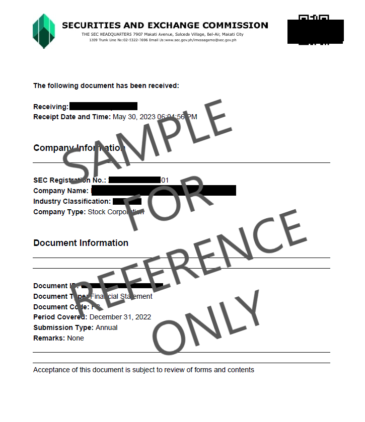 - Latest Audited Financial Statements (AFS) with SEC QR Code Acceptance