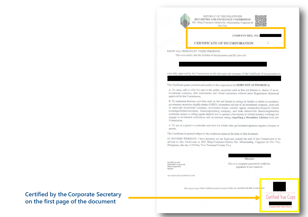 Note: For companies, businesses or partnerships registered outside the Philippines, submit comparable documents, duly apostilled by the Philippine Consulate where the corporation is registered.